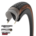 Structure: Our engineers wisely combined the technologies derived from road-specific reinforcement casings with MTB-specific one to obtain our specific ProWall gravel casing. The ProWall Gravel is a multi-ply 60 tpi reinforced and sturdy tubeless-ready carcass with added protective side wall reinforcement meant to prevent lateral cuts. This casing technology offers therefore an enhanced puncture protection still offering a supple riding feeling on various surfaces, enabling you to explore new roads.